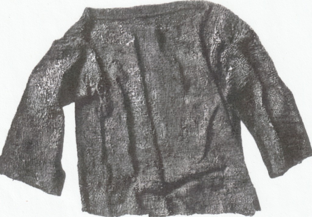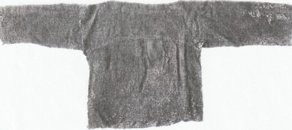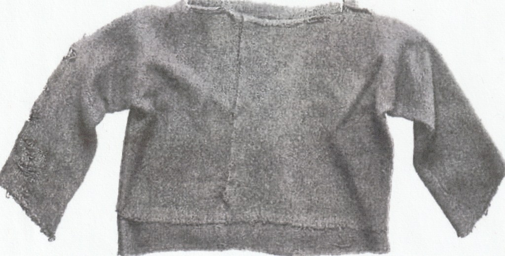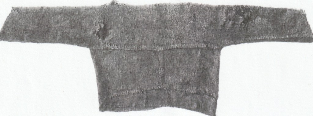 It also features small patches of fabric on either side of the rounded slit that creates the neck hole, presumably to reinforce the fabric in an area more likely to take stress. In some texts they describe these patches as reinforcing gussets, bringing to mind the small gussets found in Elizabethan smocks that both reinforces and shape the neck hole prior to adding the collar.