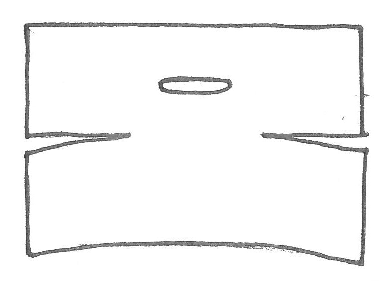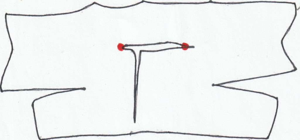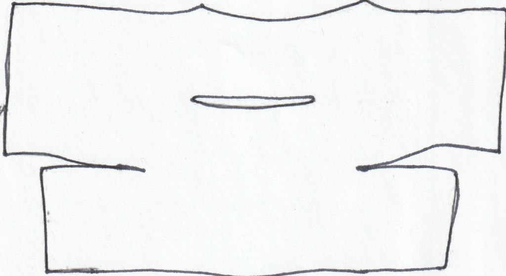 3: from the top center measure half the width you’d like your neckline to be, about 3-4 inches. (I generally err on the side of too small, since we can refine the neckline size and shape later) After measuring, go ahead and cut out a narrow strip that length along the top edge.