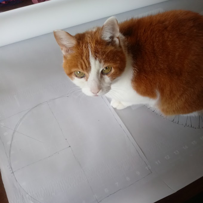 For this cap, I scaled up the pattern directly from the gridded pattern and measurements provided by Janet Arnold in PoF3. It was remarkably easy to scale, even with the assistance of my feline assistant. (*pictures of assistant included for gratuitous cat-tax) The only real tweak I made to the pattern is that the original has “39 evenly spaced dart tucks” shaping the crown. Mine ended up with 40, because it was easier to draft out an even number and my cat is really bad at counting.