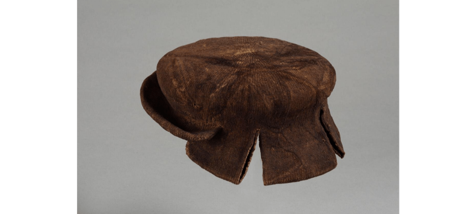 “This cap of closely knitted wool was probably originally black. The crown is flat and knitted to shape. The brim is deeper at the back than the front, and is cut so as to form four lappets (‘ears’). These have a raw edge, ie they have not been finished off with stitching or hemming. The cap probably had a felted finish which it has lost. Typically, knitting ladders when the wool is broken, but here it has not.