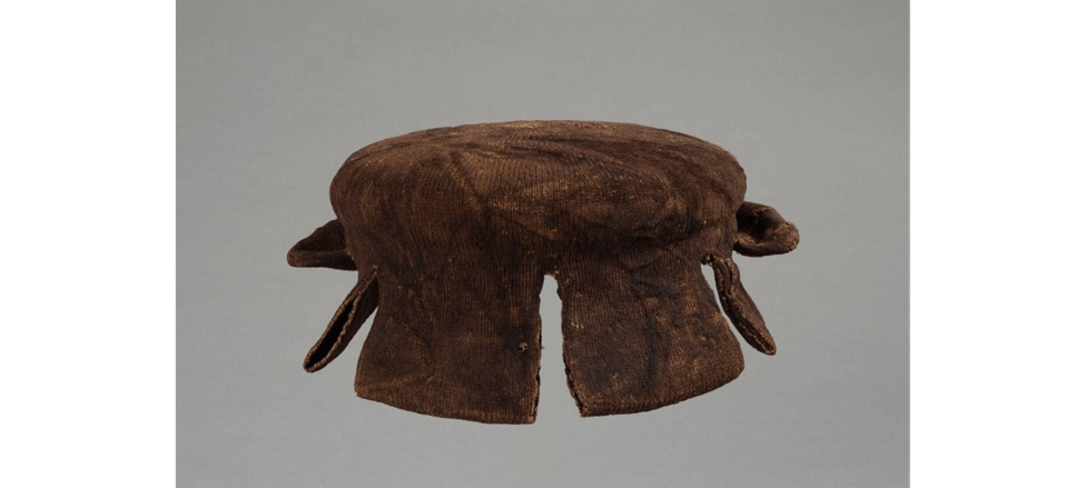 ”Cap of closely knitted wool, now purplish-brown in colour but probably originally black. The crown is flat and knitted to shape with a brim all round; the brim is deeper at the back than the front, and is cut so as to form four lappets. These lappets have a raw edge, they have been cut but not finished off with stitching or hemming. The cap probably had a felted finish which it has lost.”