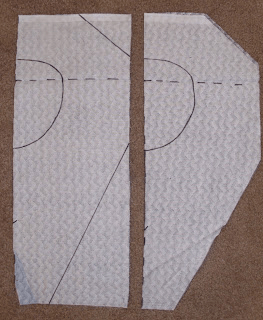 Two examples of the facing fabric, the one on the left has been marked with the shape I want the facing to be, and the one on the right has been cut out. (please ignore the wrinkles on the bottom of the facing..they didn’t look that bad when I was taking the pictures.)