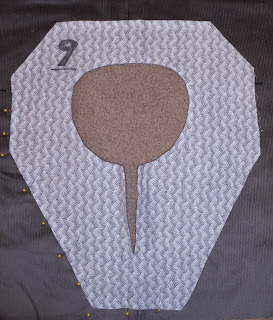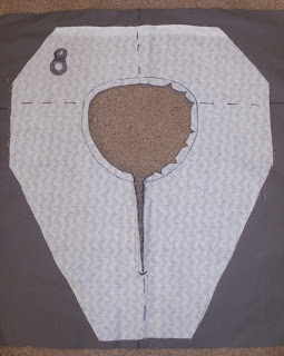 The next step is determinging the size and shape that the neckhold should be, and then marking it’s placment on your facing fabric.