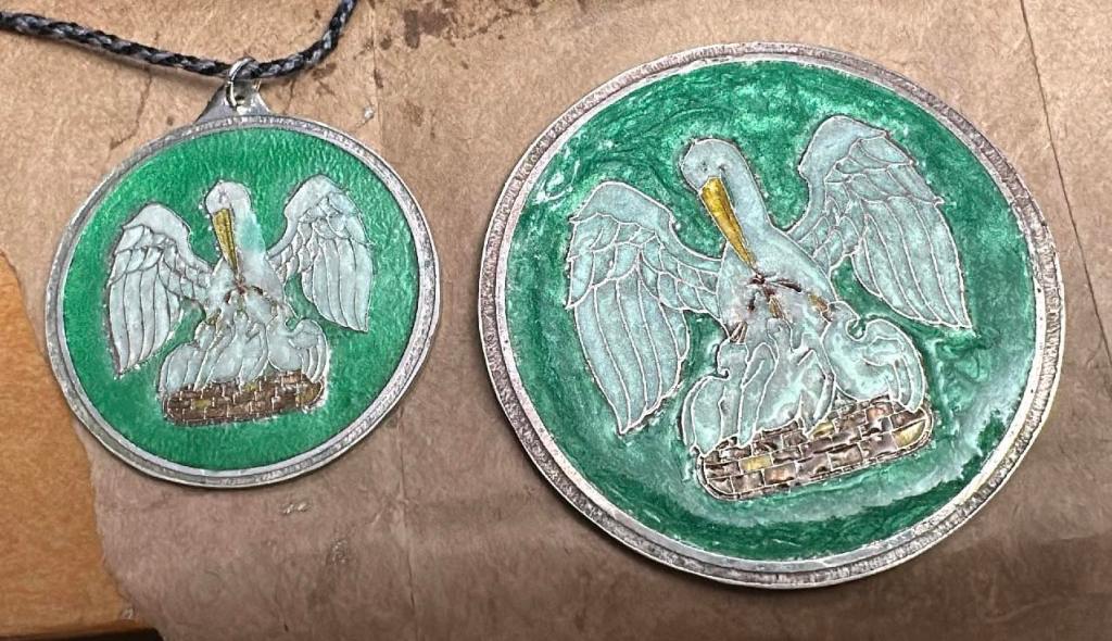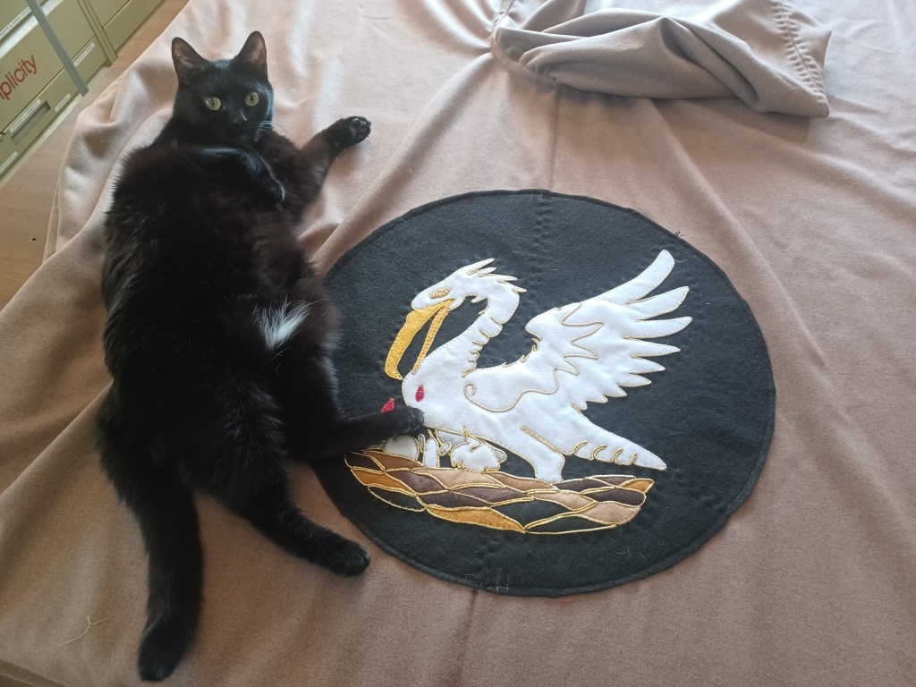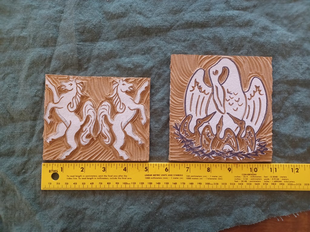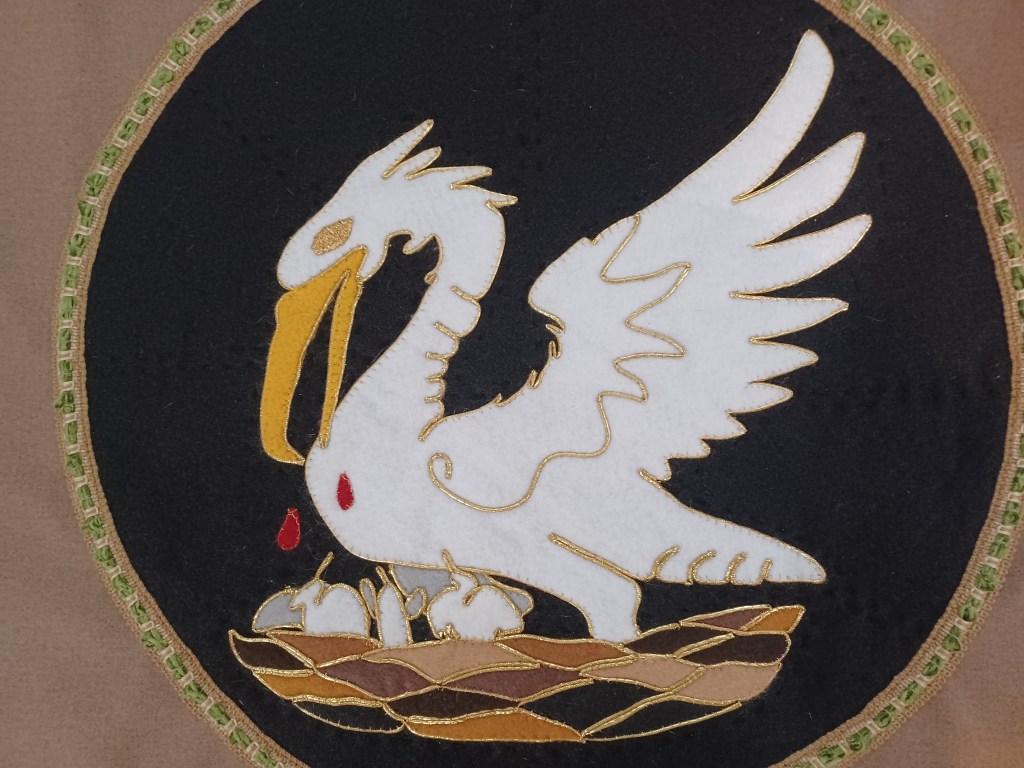 Mistress Fredeburg von Katzenellenbogen Karen Heike Spieler designed and hand carved the stamps I used for the horses, the pelican, and the leaf border, and Her Excellency Anastasie de Lamoure Anastasie DeLamoure created the showstopper of a pelican embroidery for the elevation cloak.