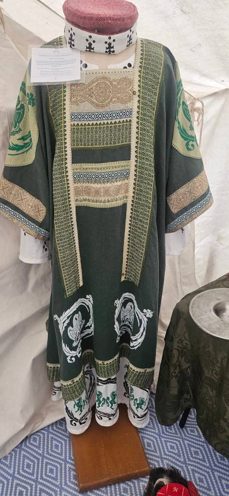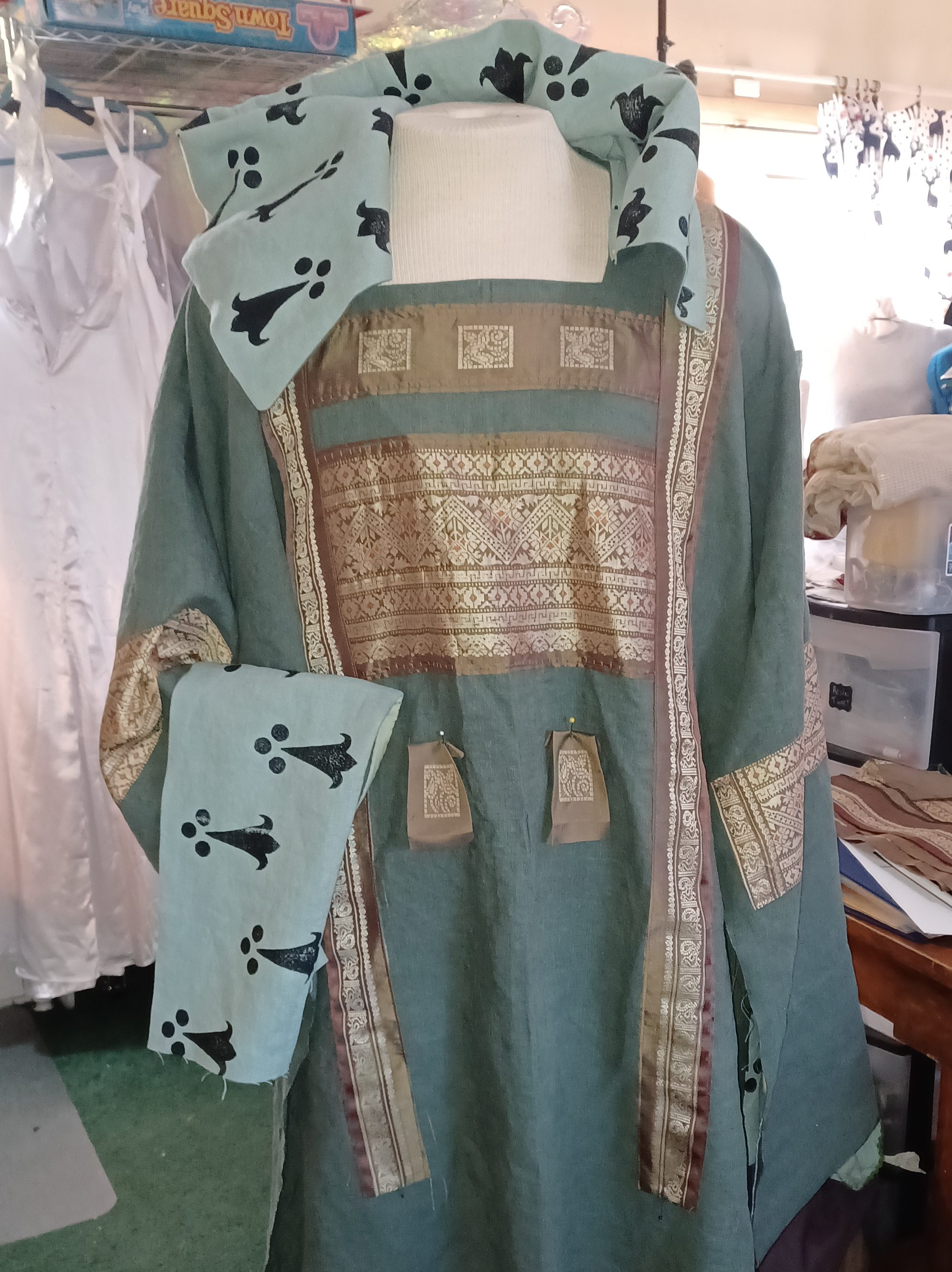 7. A Coptic Hooded Tunic, aka the Roman Hoodie, made out of linen and trimmed extensively with silk trim and stamped medallions. The hood and cuffs are lined with still more stamped ermine, and the hood features a tassel made by Lady Lorelei Hrafnsdottir