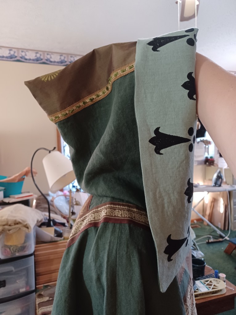 4. The over tunic is also linen, and features a gratuitous amount of silk trim, stamped rondels, and even some hand embroidery