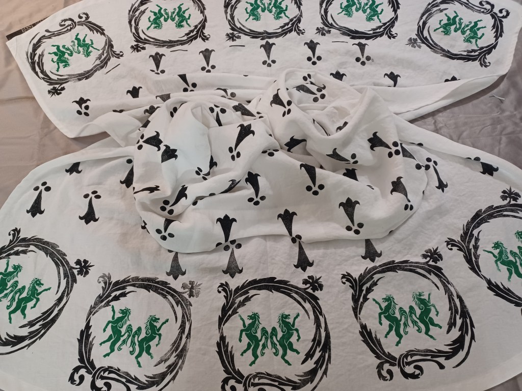3. An under tunic is white linen, stamped allover with ermine and featuring a stamped border of rearing horses inspired by Kennys heraldry.