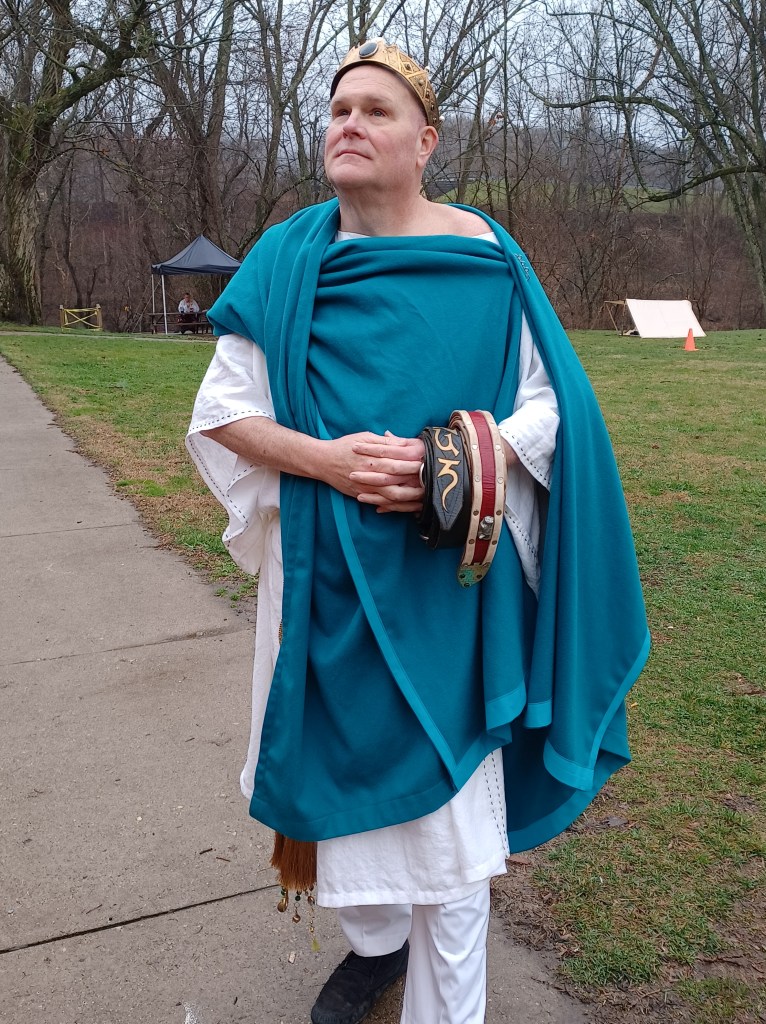 1. A plain and simple early Roman Tunica out of white linen. (the plain and simple part just about killed me, FYI), all hand stitched save the hem. 2. It is worn with a Sagum (type of Roman Cloak) out of a green wool, possibly a blend, pined at the shoulder with a simple fibula pin crafted by Erzebet Fauconneau (one of the ones you made Hrafn and I for Crown Tourney!)