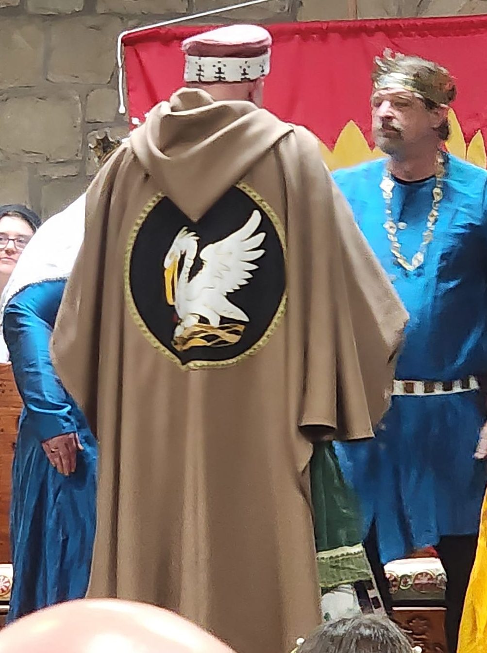 This cloak was the vehicle used to showcase the lovely pelican piece created by Her Excellency Anastasie, as well as the base for the Pelican Cloak Pin (and medallion) created by Peri Nelson-Sukert.