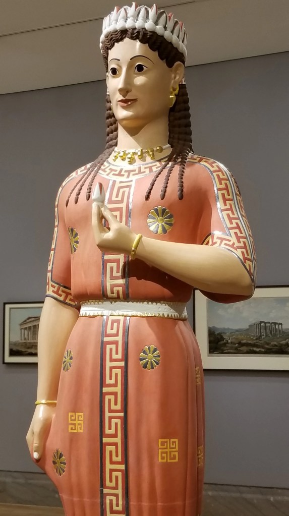Reconstruction of the so-called Chios Kore (Young Girl) from the Athenian Acropolis 520 BC. Cast of marble figure, painted with pigments in egg tempera. Traces of color on the skin and clothes were recorded by Emile Gilleron in the 1880s. Scientific analysis has verified the presence of several pigments, and these results are used as the basis for the reconstruction. Part of the Gods in Colour exhibition at the Ashmolean Museum 2015 https://www.metmuseum.org/art/collection/search/853959