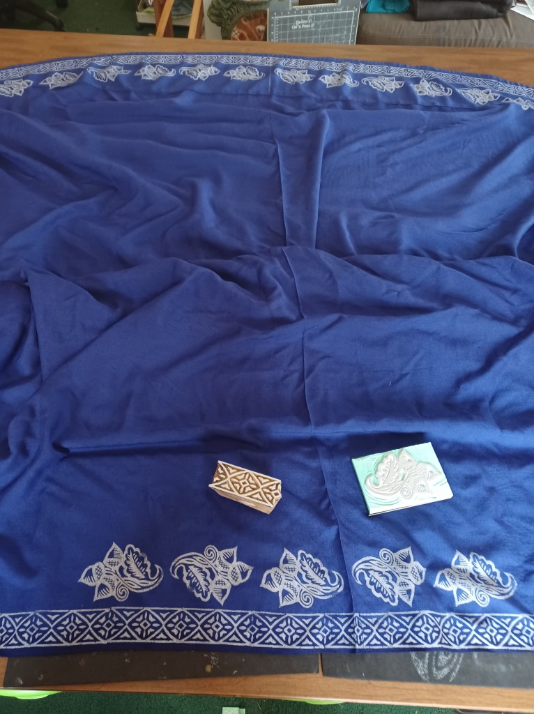 Over all *should be* draped a Palla, or shawl, in the same blue cotton as the Tunica, heavily embellished with block printed elements in white, silver and gold, and having small metal acorn charms at the corners to act as weights.