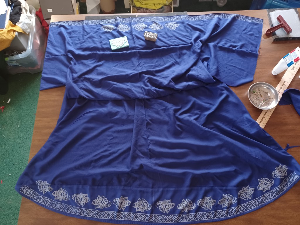 *Note: As you will read in the Palla section below, the weather, and the increased drying time it has caused my block printing inks, has created unexpected hurdles for this project. It took so long for the printed designs to dry, despite doing the printing (in what would typically have been) plenty far enough in advance, that I had to do most the sewing of this Tunica between mid-night and 3am on the morning we started the drive north to this event. And even then the back top edge was still slightly tacky, meaning I had to be extra cautious in my handling of the garment.