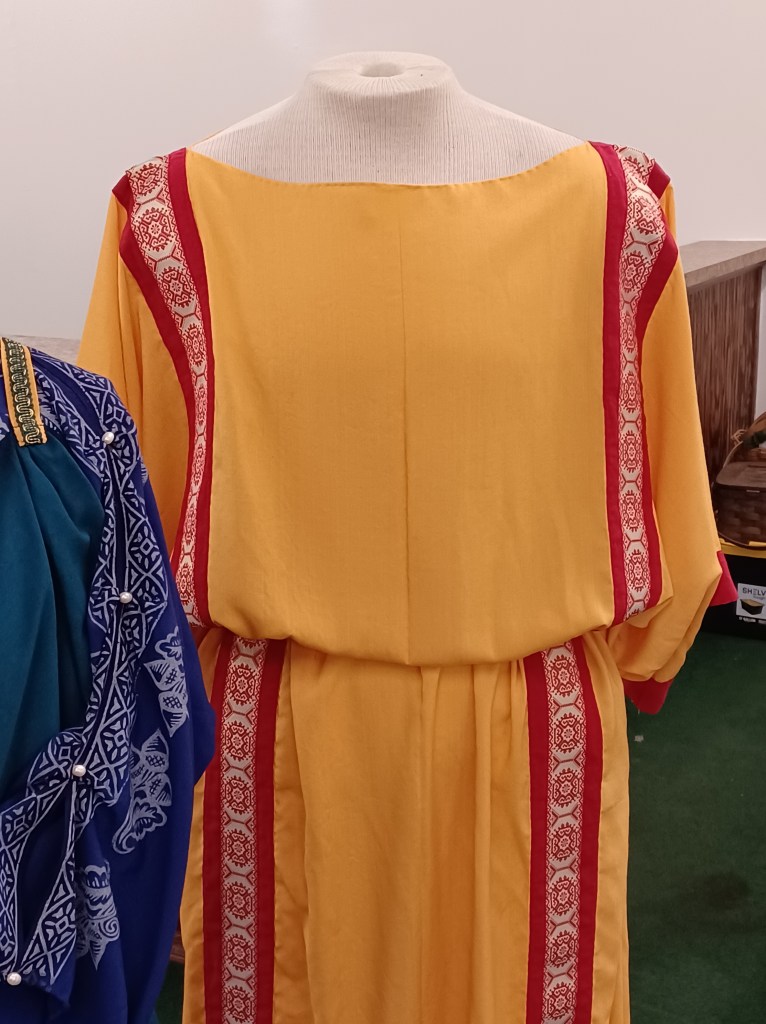 For His Majesty I made a relatively basic sleeved Tunica in a rich saffron yellow and featuring Clavii and sleeve trim in a lightweight red linen. Additionally the Clavii are embellished with a rich woven trim in gold and red.