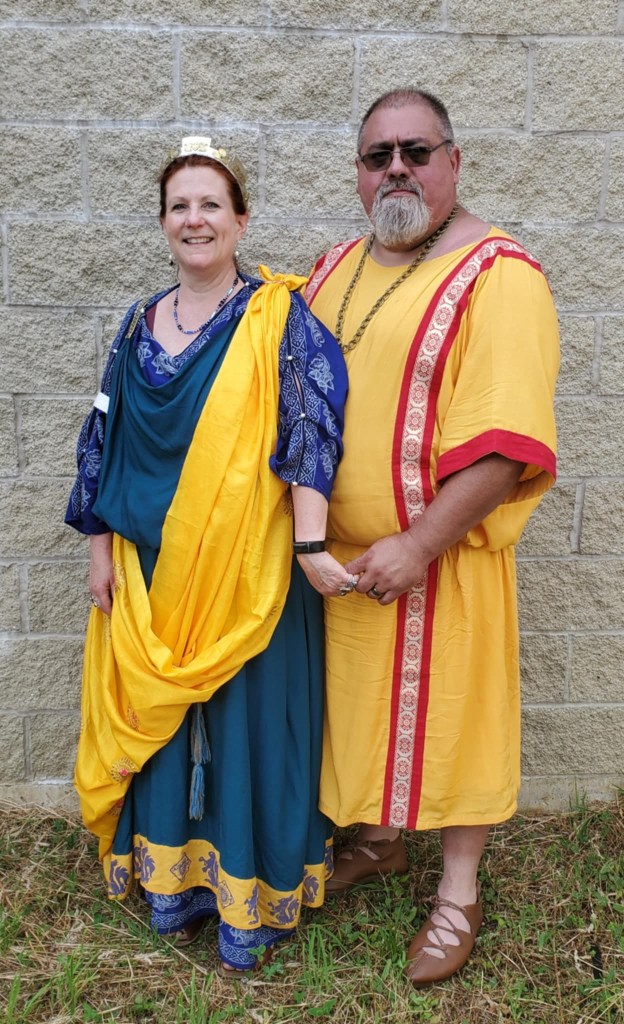 The intention was for a set of clothes that Their Majesties could wear for more “dressed-down” occasions. Something easy and comfortable for hot weather, but still regal enough to befit the Crowns of AEthelmearc.