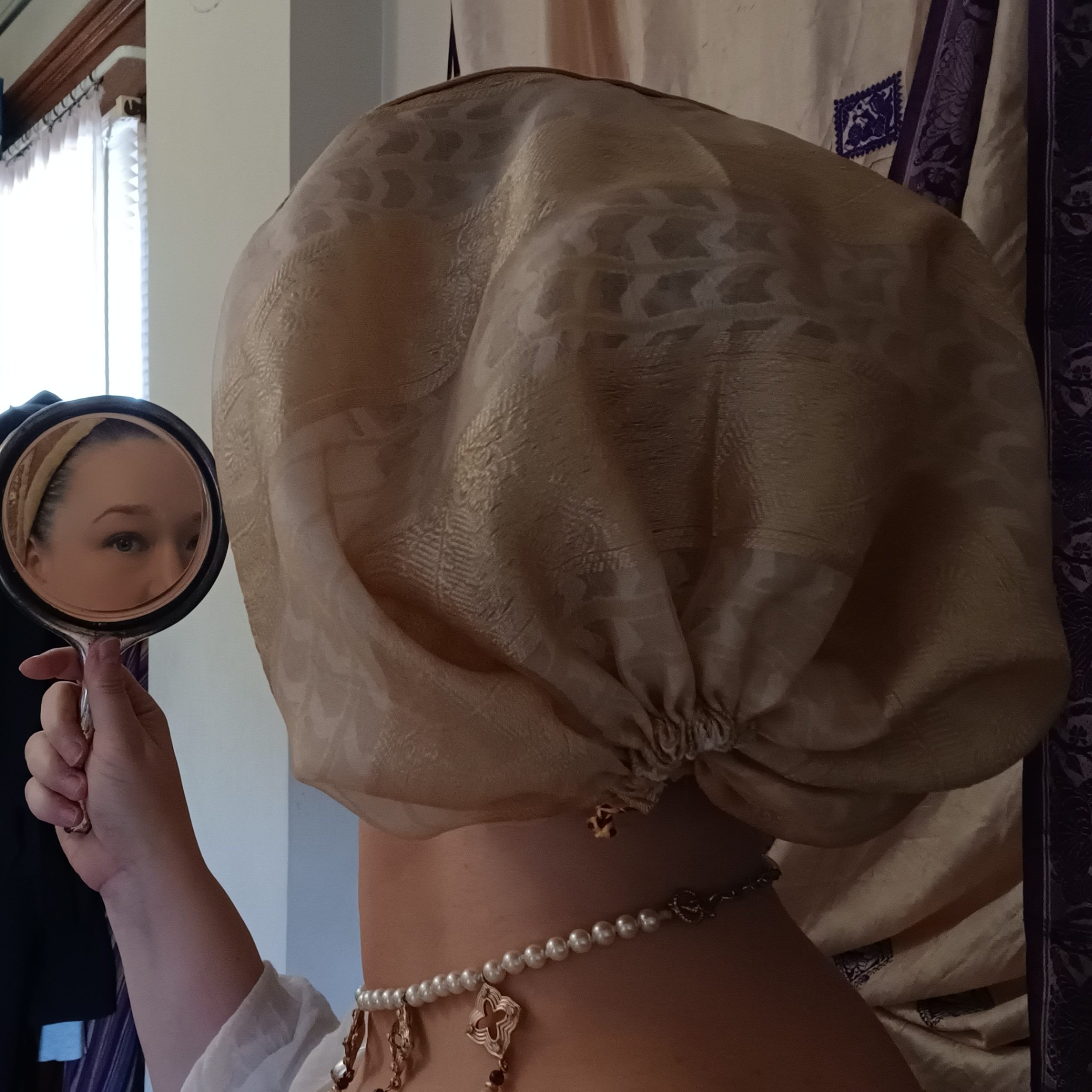 The “hoods”, or hair bag, section of each haub feature the same sheer pale gold fabric with denser woven stripes that feature a subtle embossed floral design. (I have no idea what the fiber content is, but I highly doubt it’s anything remotely natural. But man it’s pretty!) Since this fabric is so sheer, I choose to line it on both goldhaubs.
