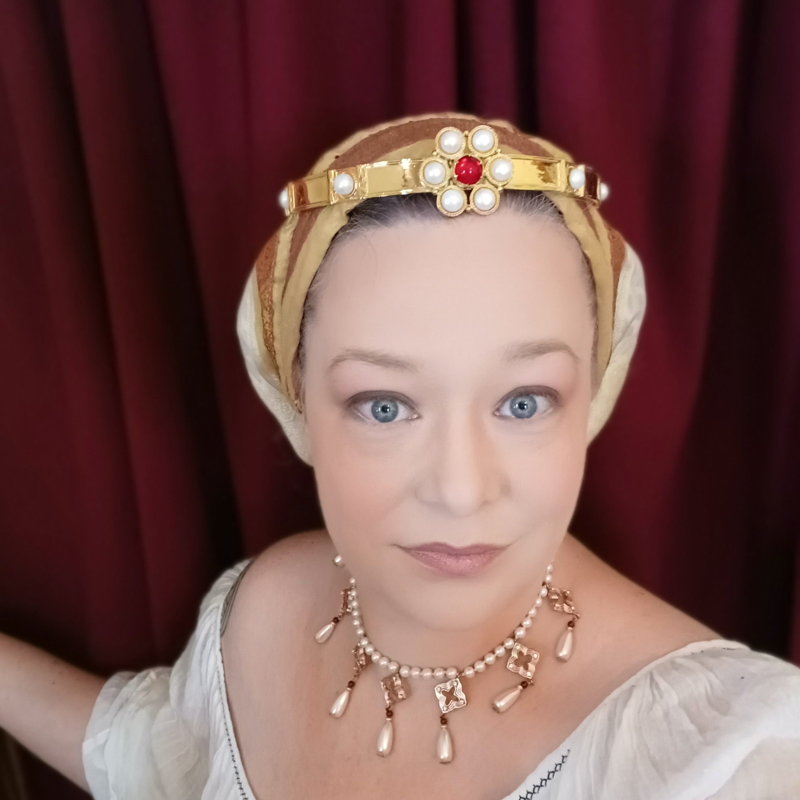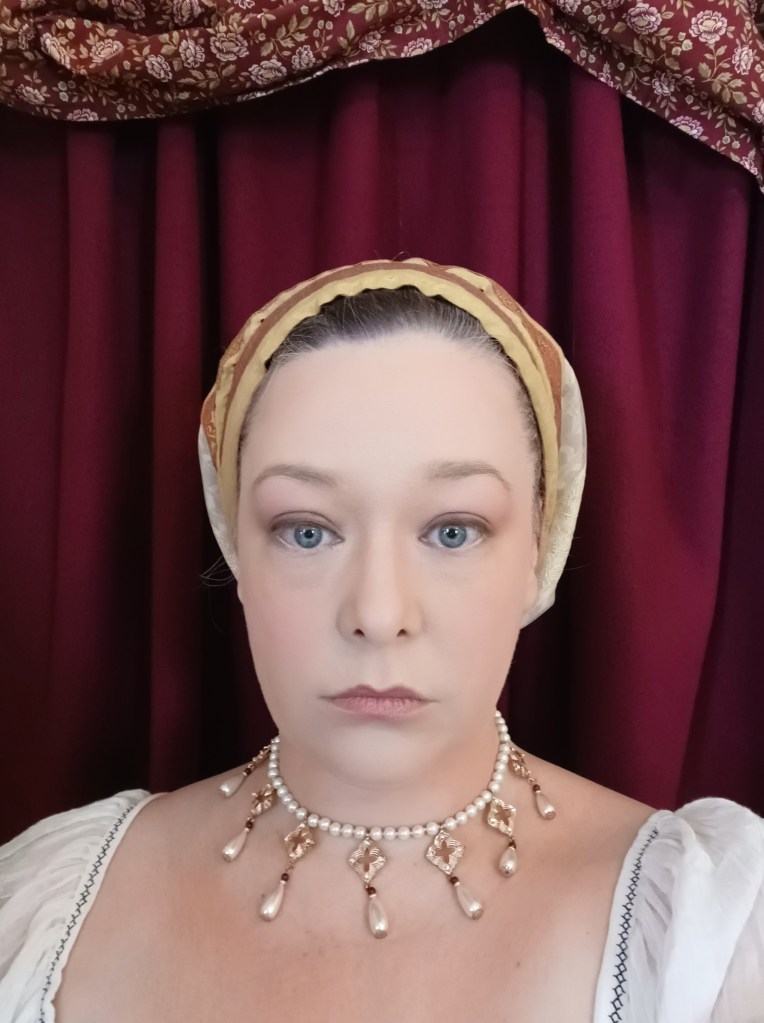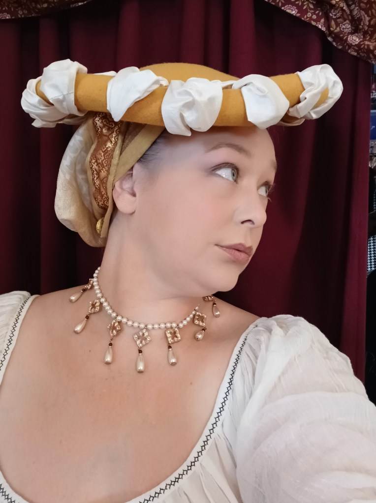 In the future I would still like to experiment with a goldhaub made up of separate elements styled on the head. I would also like to play around with changing the proportions of the hood piece, making it wider and/or changing the overall shape a bit to see it i can get the more exaggerated look seen in some paintings. (*Note added: the original creator actually recommends stuffing out the back of the goldhaub with a bit of polyfill to help hold it out and create the iconic silhouette. I did not do this with mine because I personally really prefer to wear the closer fit.) Additionally, I would really like to try making a goldhaud that is just ALLLLLLL the way blinged out with pearls, as you see in so many of the period images.