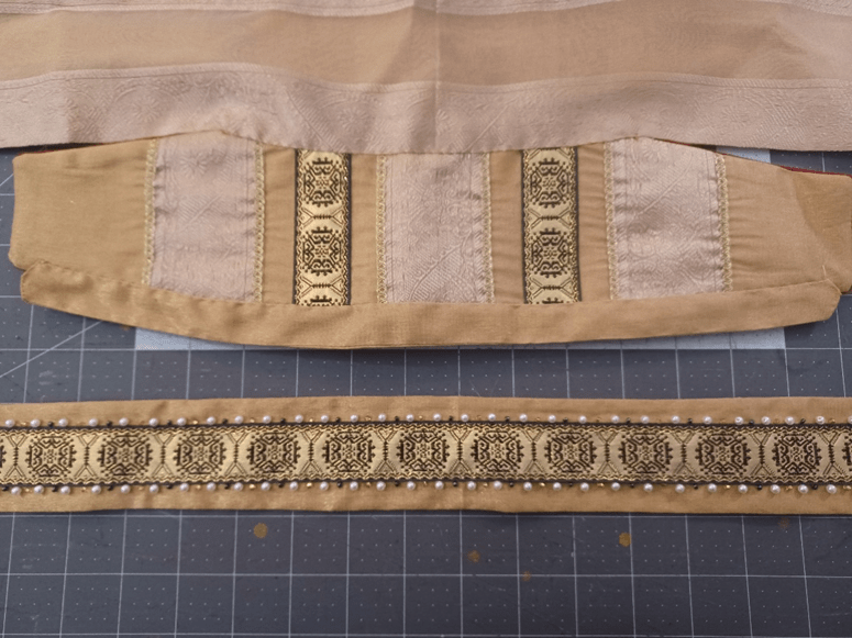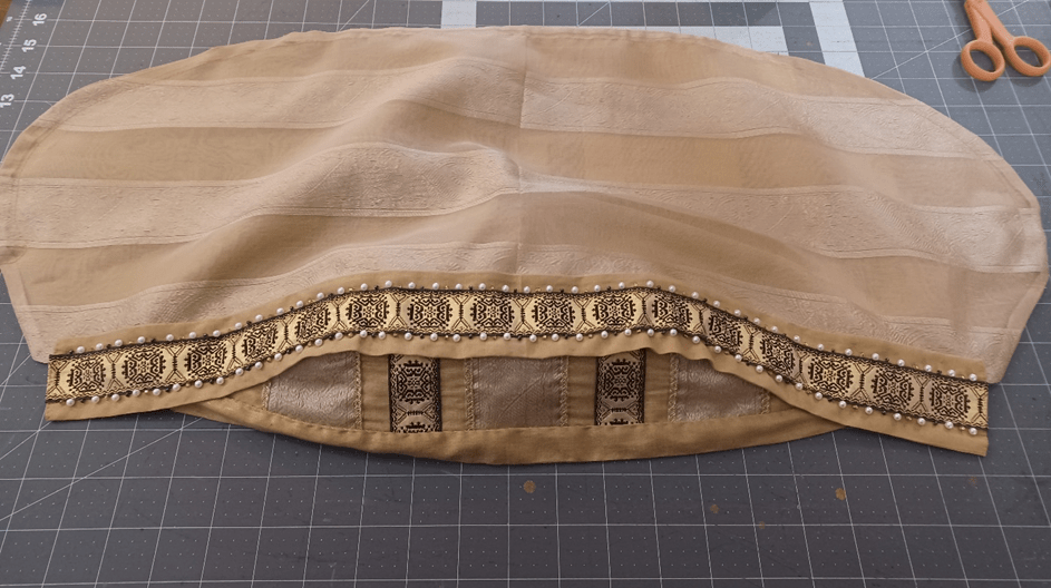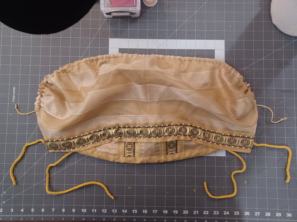 On the display model, I used some of the same gold cross woven I used for the bands and crowns. For the one I am wearing I went even lighter and used a second semi-sheer fabric featuring a cool zig-zag pattern woven in.