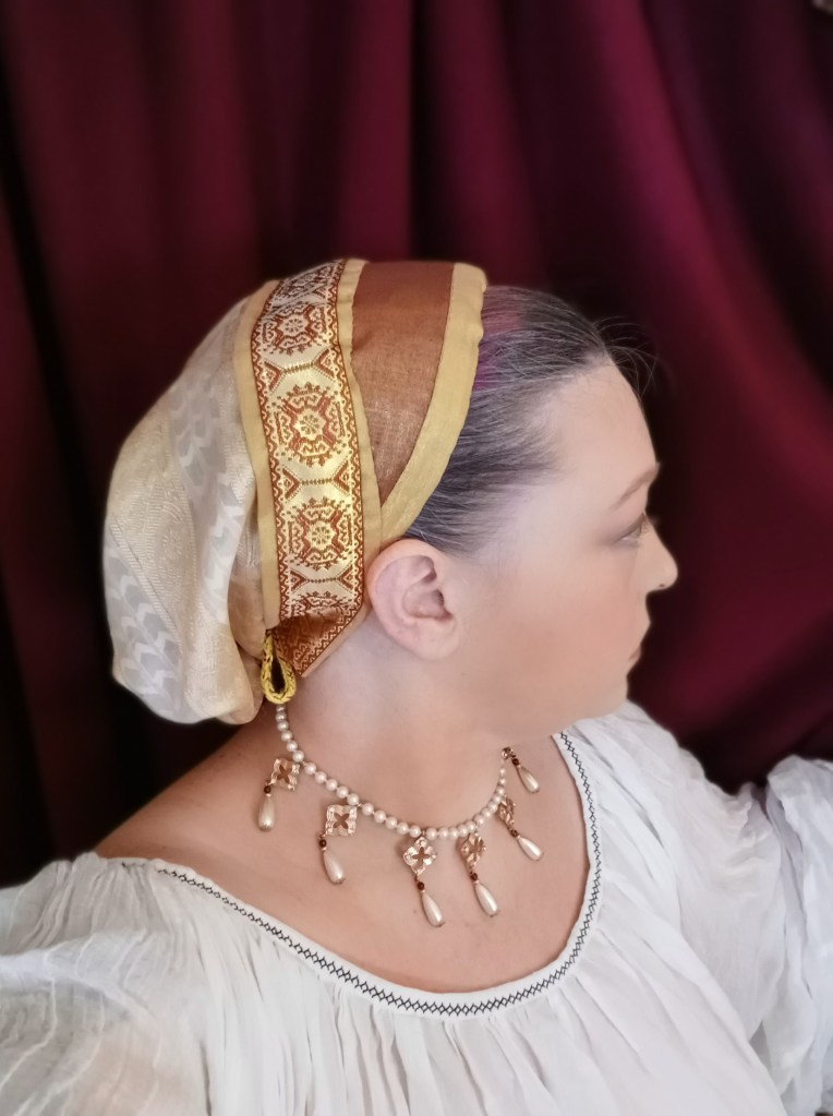 In addition to wanting to experiment with lighter fabrics, part of the reason I wanted to go thru the process of making a goldhaud using this method again is because I have doubts as to whether this particular style of goldahub would have been a single one-piece garment, or if instead it might have been a collection of items all worn together to create this look. Perhaps along the line of the English Tudor and Elizabethan ( and later) eras Coif and Forehead Cloth combination.