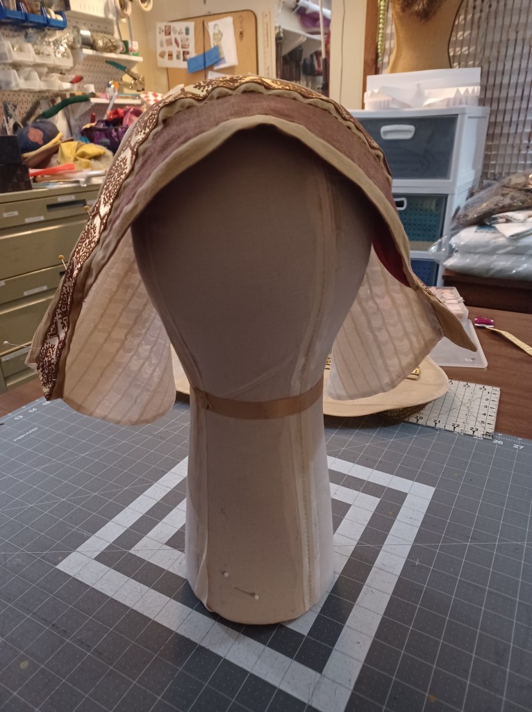 When I was first putting this all together it all felt rather overly fussy and a like a lot of odd choices were being made, however as I went I came to appreciate how this method creates a very wearable shape that already just wants to fit on a human head with very little else needed. At this point, it actually started to remind me a lot of early English Hoods from the Tudor period.